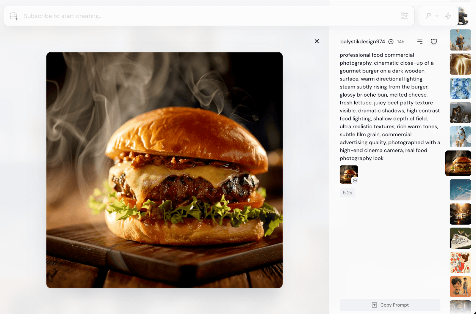 For example, here’s the prompt to create an ultra-realistic, cinematic close-up of a gourmet burger: