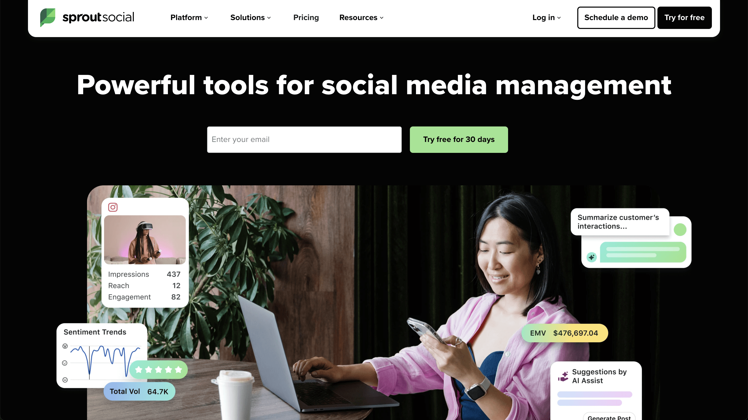 Pricing: Starts at $199/month per user (Standard plan). Professional at $299/month per user. Advanced at $399/month per user. Per-seat pricing adds up quickly for larger teams. 30-day free trial available with no credit card required. Note that social listening and advanced sentiment analysis are only available on higher-tier plans.