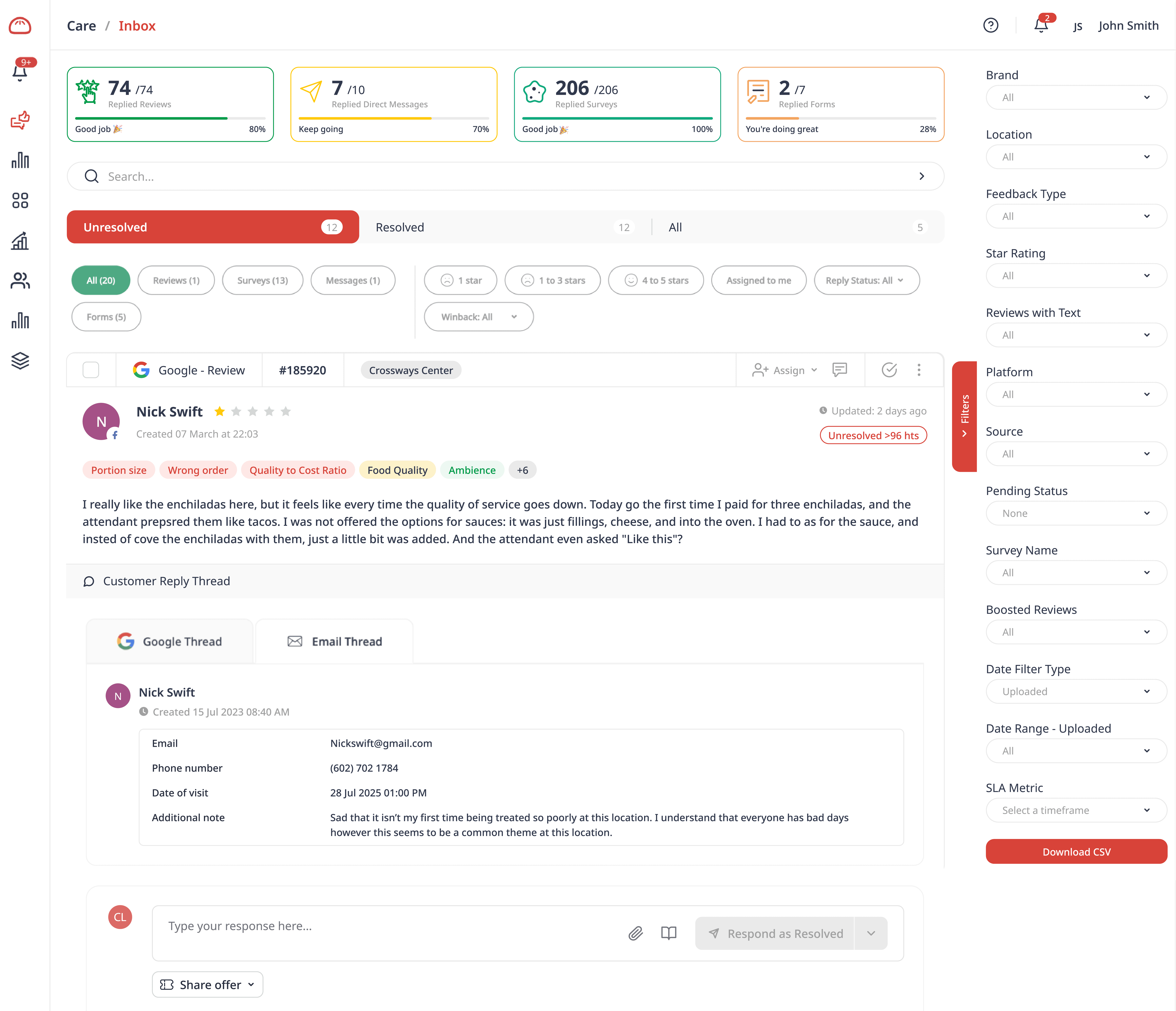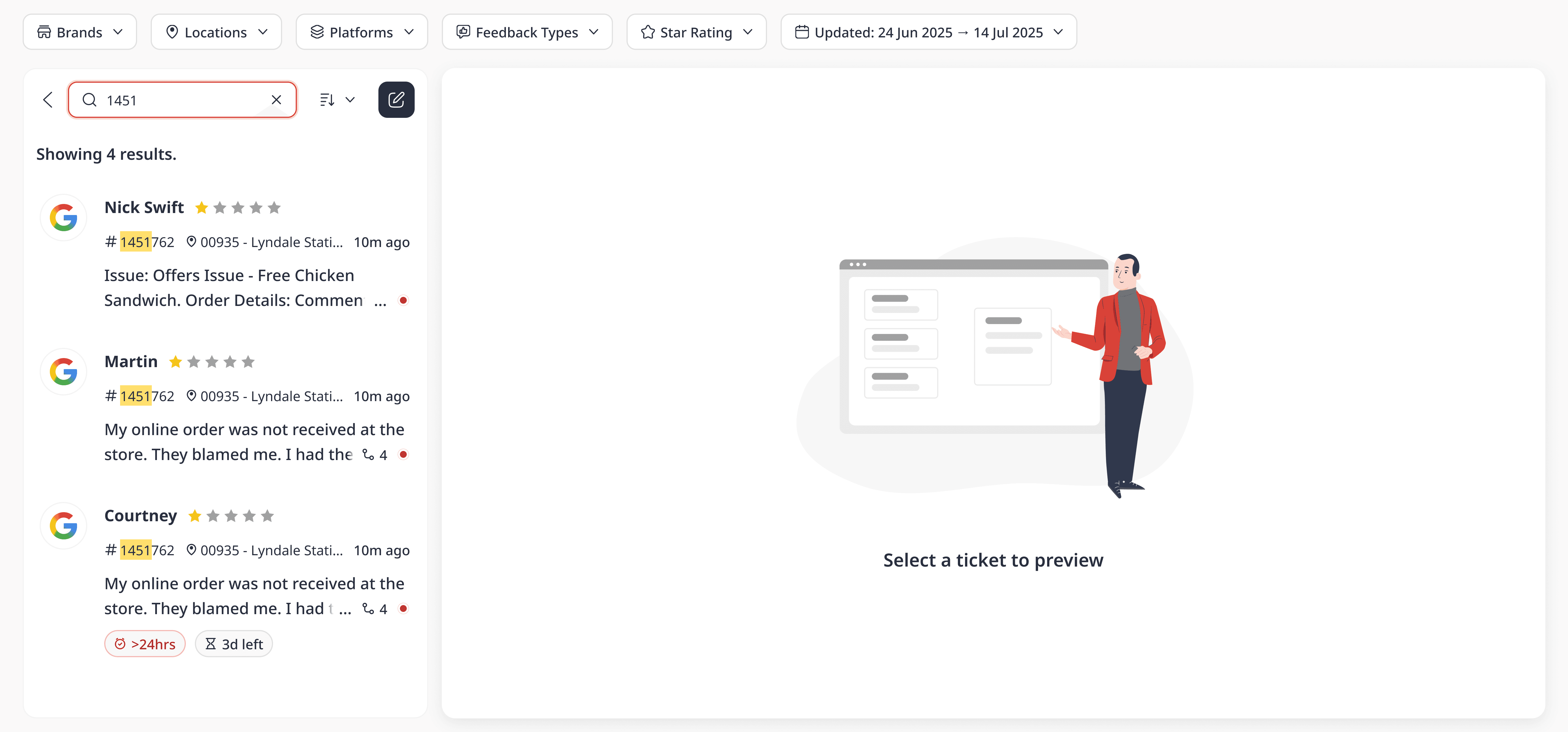 The intuitive search bar helps operators quickly locate past conversations or reviews without navigating away from the inbox.