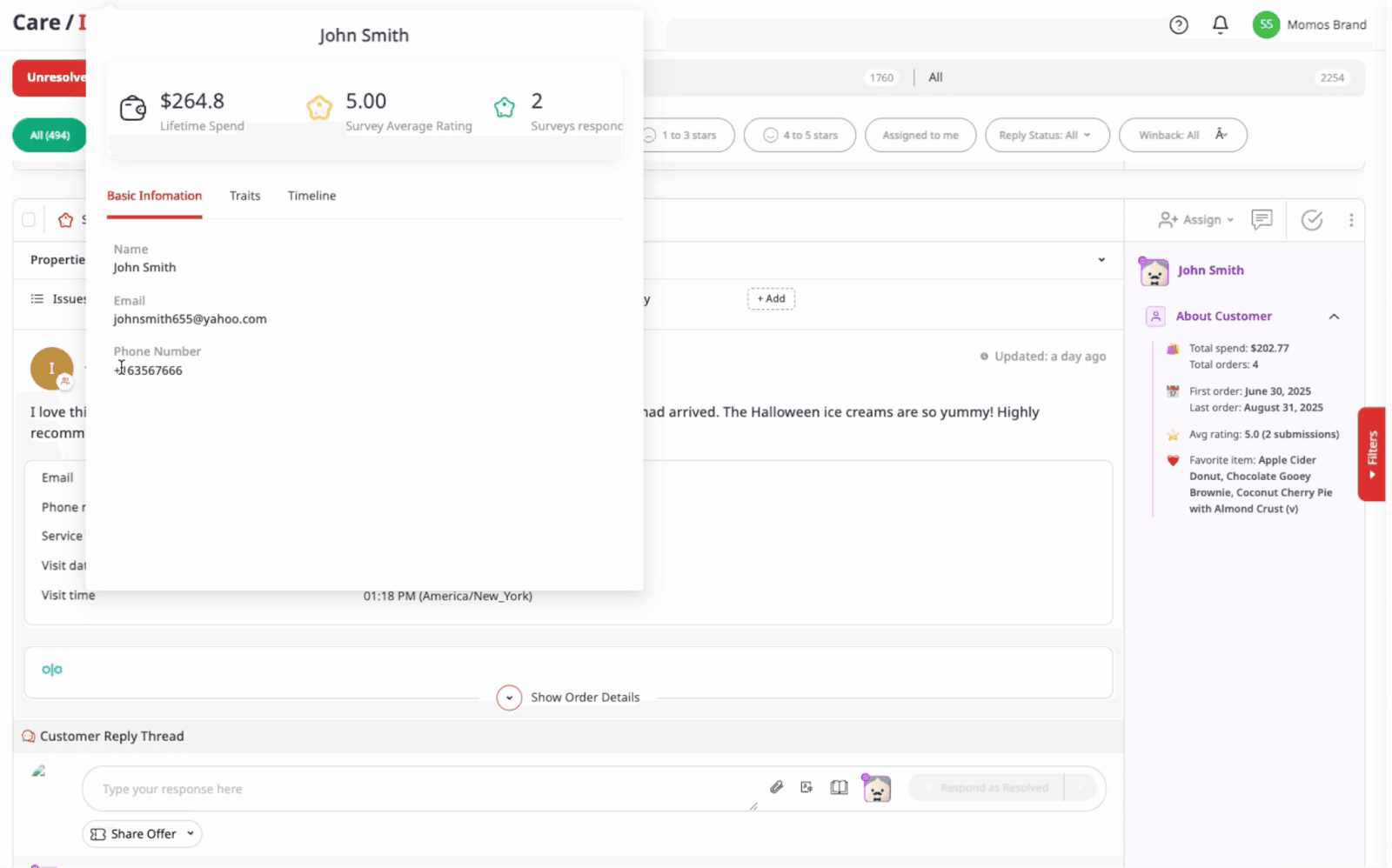 Simply hover over a customer’s name in the Unified Inbox to instantly view their profile, history, and loyalty details or check the right-hand panel for a clear, AI-generated summary. With AI summarization built in, support teams can respond faster, personalize replies, and handle every case with more context and confidence.